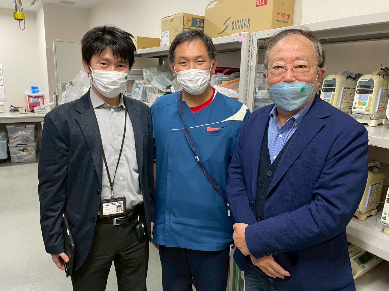 ▲フィラピー台湾本社の代表(右)、公立丹南病院を訪問。中央は、臨床工学室長の竹内雅樹氏。フィラピーの活用について現場で意見交換を行いました。